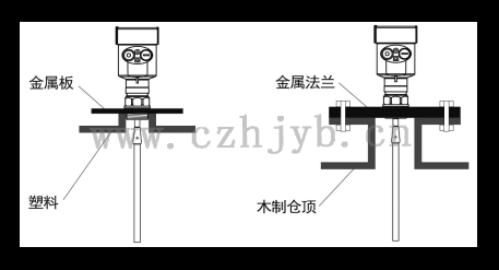 無論是纜式或桿式,若想導波雷達工作正常,過程連接表面應為金屬。當導波雷達裝在塑料罐上時,若罐頂也是塑料或其它非導電材質時,儀表需要配金屬法蘭,若采用螺紋連接,需配一塊金屬板。