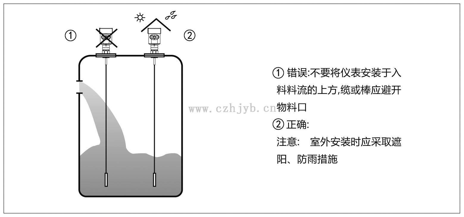 下述的安裝指南適用于纜式和桿式測量固體粉料或液體。