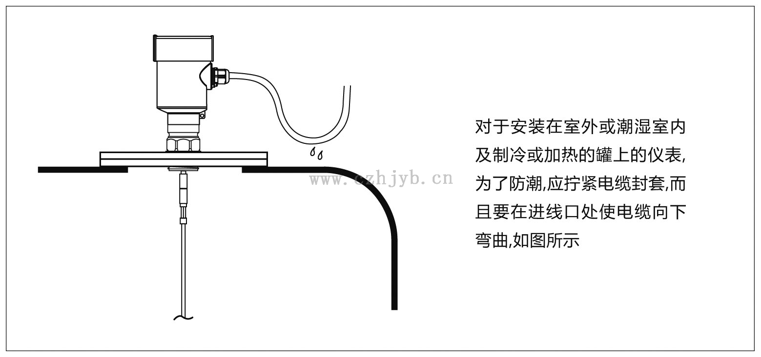 本儀表完全滿足防護等級IP66/67的要求,請確保電纜密封頭的防水性。如下圖: