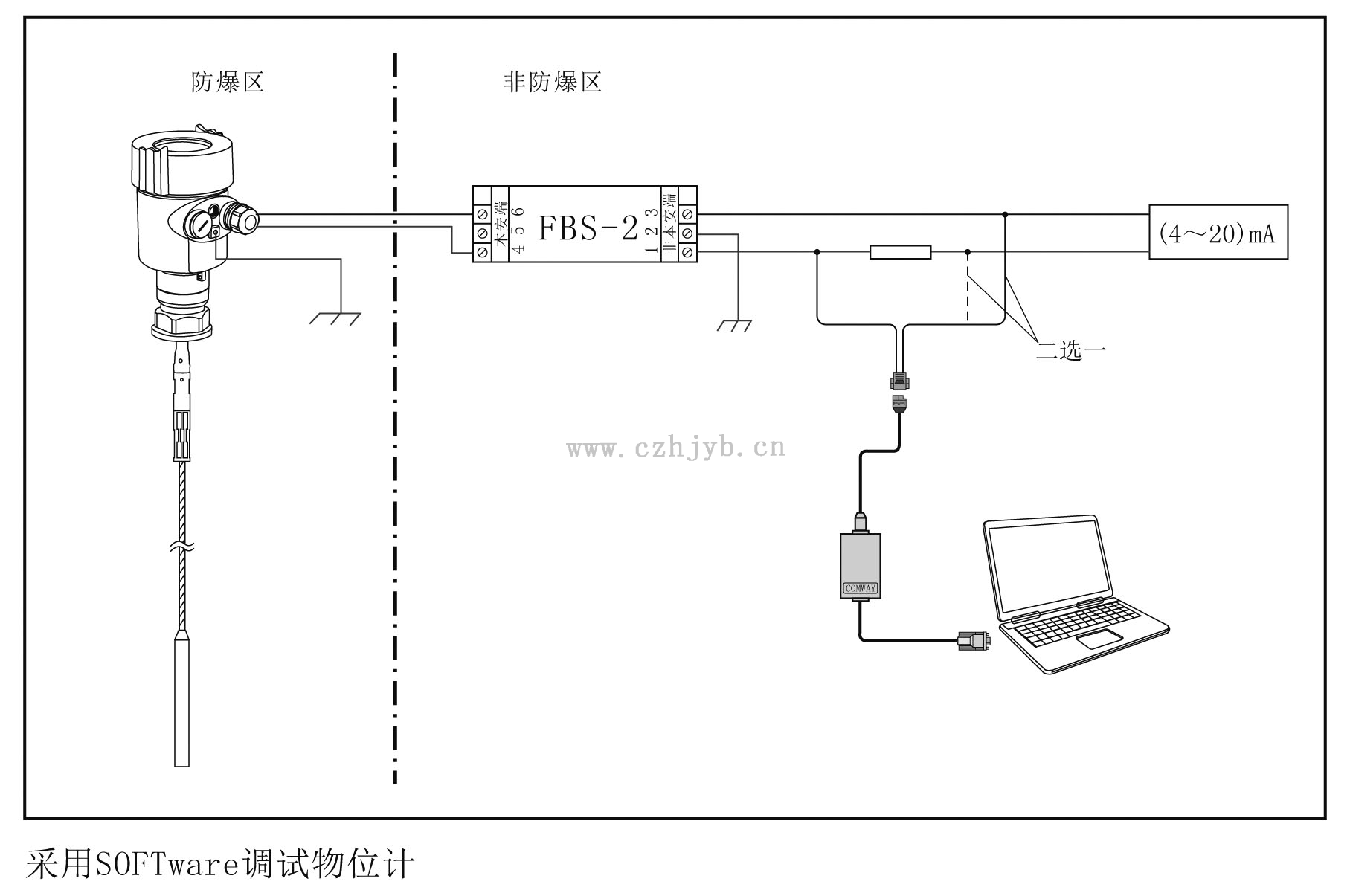 本產品使用時須用安全柵供電。FBS-2安全柵系本產品的關聯設備,防爆形式為本質安全型。防爆標志:[Exia] IIC ,供電電壓(21.6~26.4)V DC,短路電流為135mA,工作電流(4~20)mA。