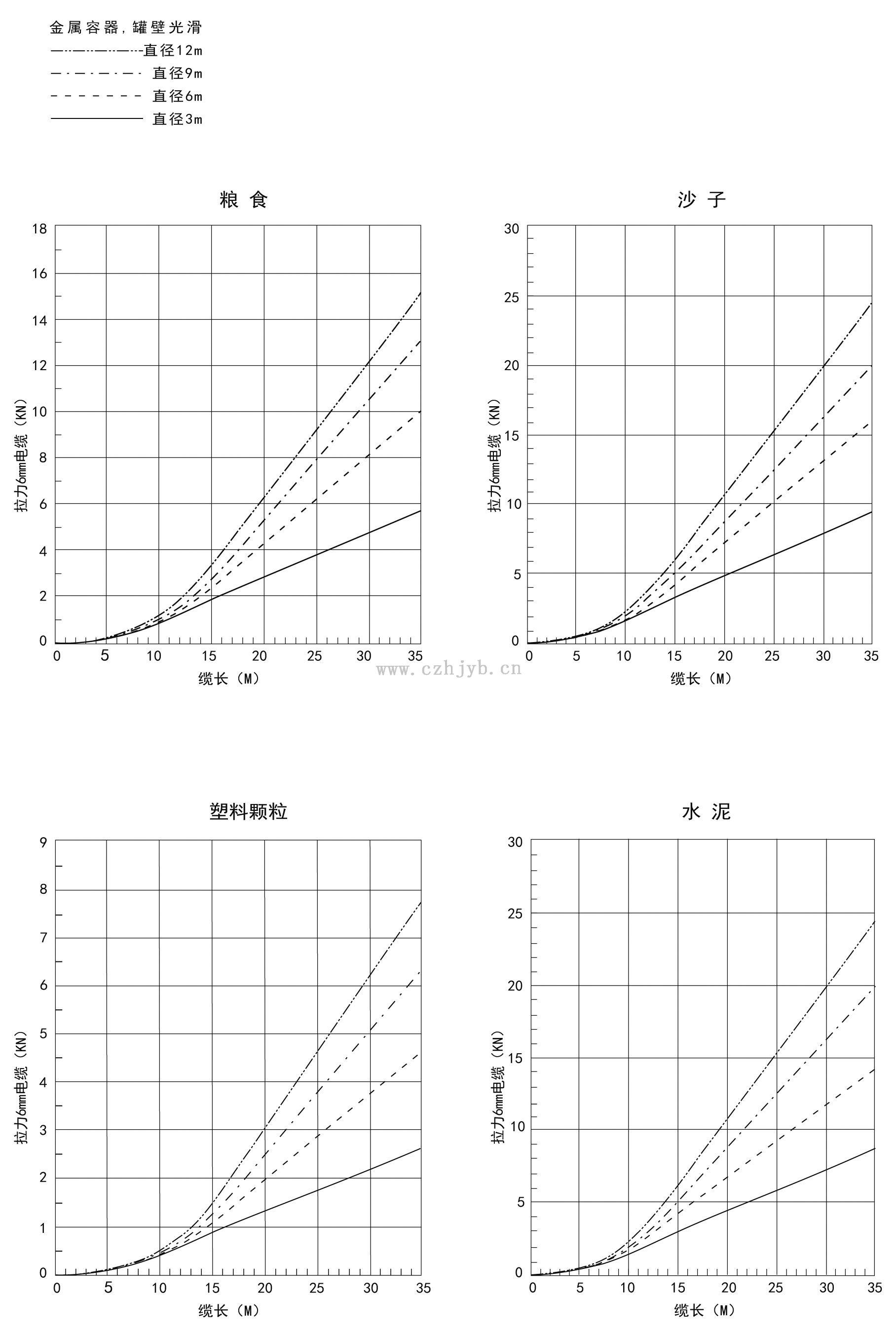 在測量固體介質的時候,拉力取決于容器直徑和物位,以下顯示的是一些典型介質產生的拉力。